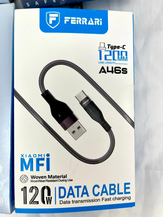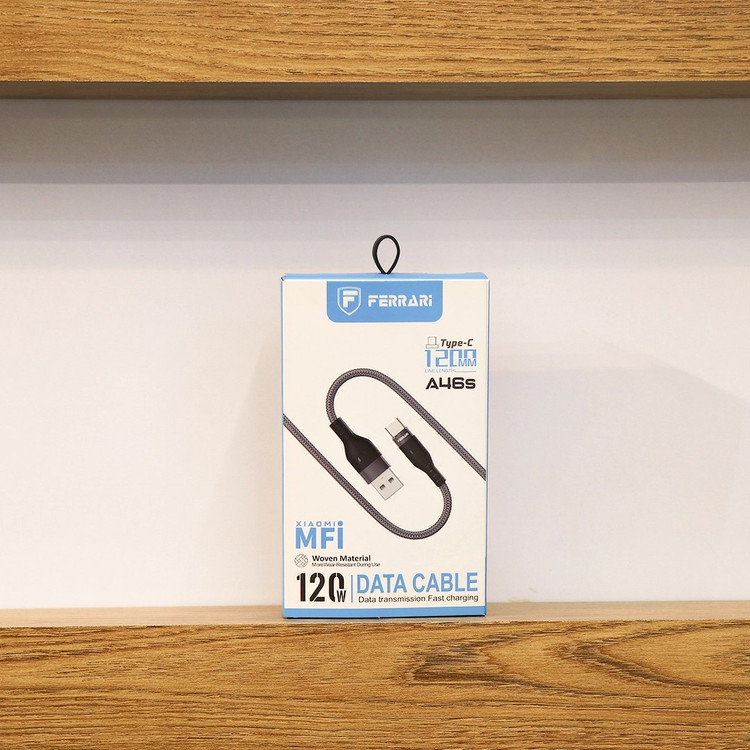 کابل تایپ سی به تایپ سی مدلA46sاز برند معتبر فراری اتصالات کابل از جنس فلزی و جنس کابل از کنفی و این کابل دارای قابلیت سوپر فست شارژ 120وات و نیز دارای MFI XIAOMIکیفیت عالی طراحی شده در کالیفرنیای آمریکا دارای 6ماه گارانتی تعویض
